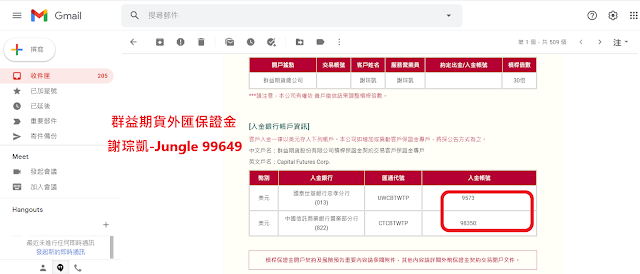 匯入指定保證金專戶→當初開戶資料填寫的電子信箱會收到一封”期貨外匯保證金交易專區開戶密碼函“,指定保證金專戶帳號就在信裡,如下圖紅框所示。然後拿著身分證及外幣存摺至銀行臨櫃辦理約定帳戶轉帳,辦理前先跟行員說是群益期貨外匯保證金開戶的約定轉帳,他們就知道了,可以節省很多時間,除了可以網銀轉帳,也可以到約定的外幣存摺銀行臨櫃辦理匯款到客戶保證金專戶。